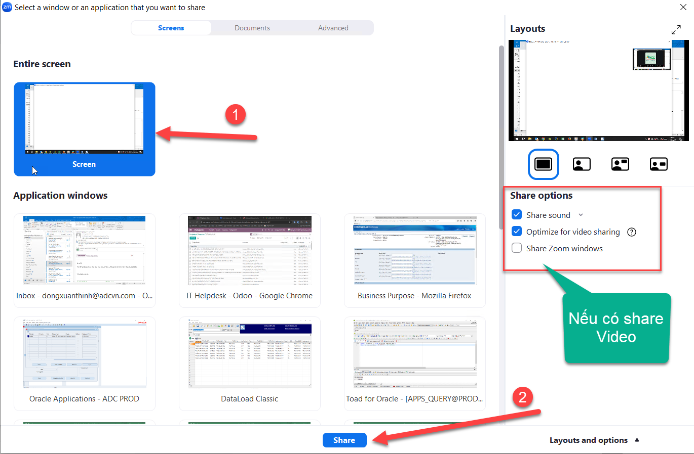 Nếu có share video có âm thanh thì chọn bật Share soundOptimize for video sharing như trong hình.