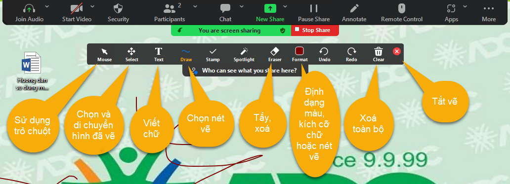 Phải đang share màn hình thì mới vẽ được. Hướng dẫn share màn hình ở đây: